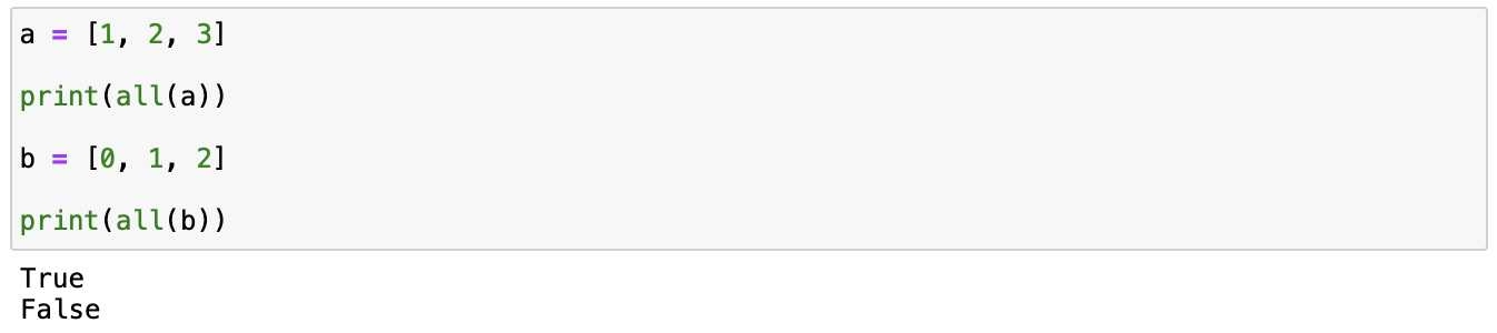 이터러블의 모든 요소가 참이면 True를 반환한다. (또는 이터러블이 비어 있는 경우)