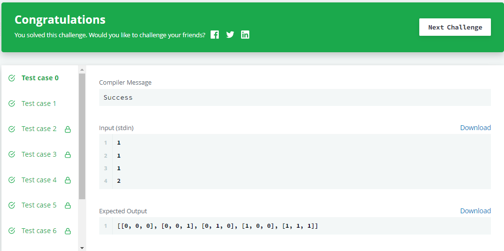 [[0, 0, 0], [0, 0, 1], [0, 1, 0], [1, 0, 0], [1, 1, 1]]