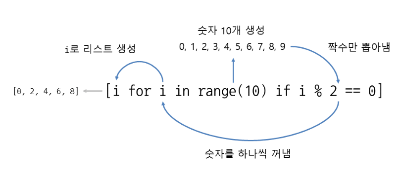 파이썬의 리스트가 특이한 점은 리스트 안에 for 반복문과 if 조건문을 사용할 수 있다는 점입니다. 이렇게 리스트 안에 식, for 반복문, if 조건문 등을 지정하여 리스트를 생성하는 것을 리스트