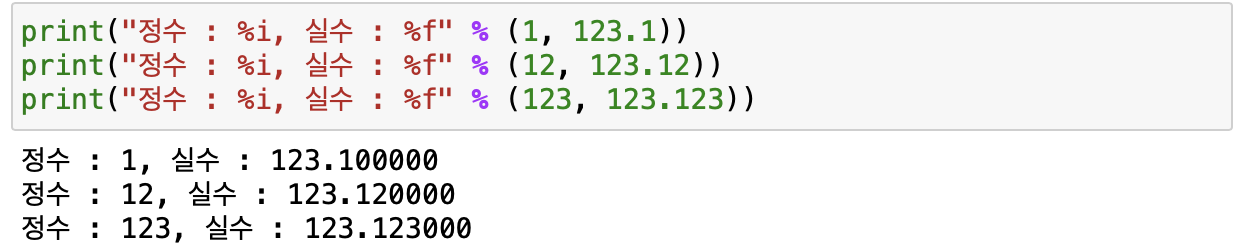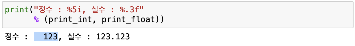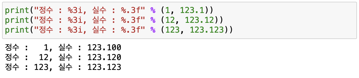 결과를 보면 정수형은 앞에 공백이 2개 생겨있는 것을 확인할 수 있고 실수의 경우 소수점 3자리까지 출력되는 것을 확인할 수 있다.