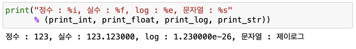 print("정수 : %i, 실수 : %f, log : %e, 문자열 : %s"