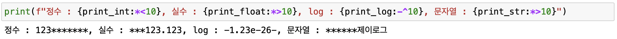 format() 함수를 사용하는 대신 출력문 안에서 변수를 입력하고 원하는 자릿수를 지정해주고 빈 자리를 채워줄 수 있다.